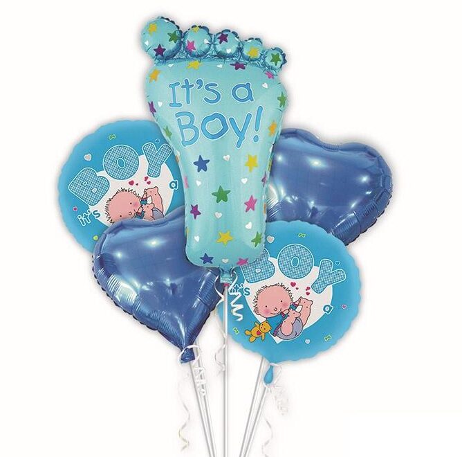 Περιλαμβάνονται 5 μπαλόνια σε συσκευασία: 2 x 18″ γαλάζιες καρδιές, 2 x 18″ στρογγυλά Boy, 1 supershape πατούσα